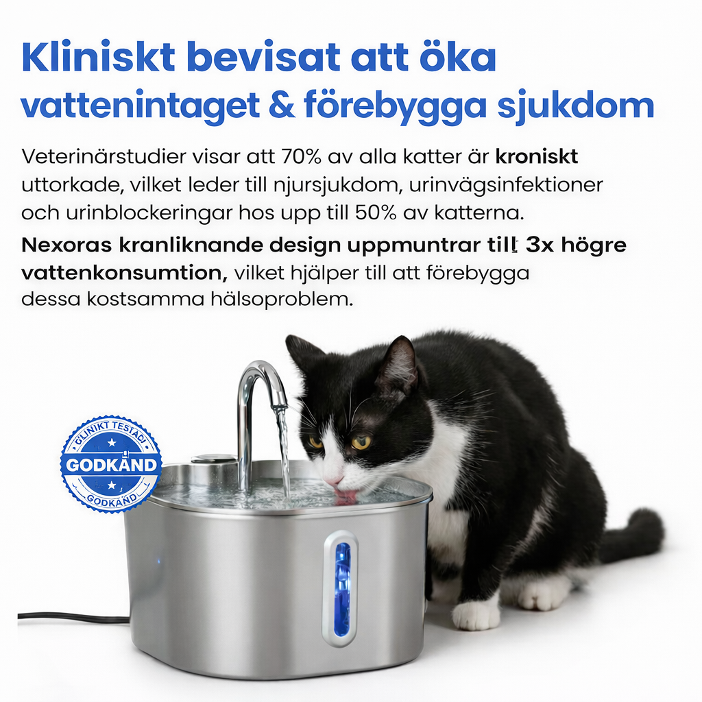 Nexora vattenfontän utnyttjar din katts naturliga instinkter för att tredubbla deras dagliga vattenintag, vilket förebygger njursjukdomar, urinvägsproblem och dyra veterinärbesök – samtidigt som du får fullständig trygghet kring din katts hälsa.