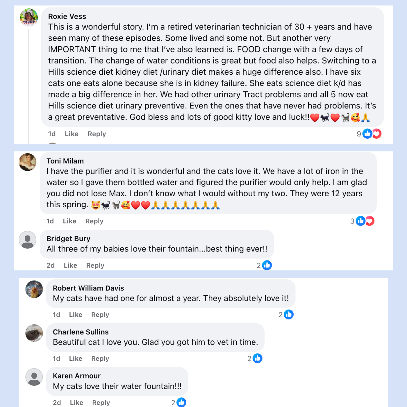 Jag borde ha köpt det här för länge sedan till min stora kille! Min 9 kiloskatt dricker väldigt mycket vatten varje dag, och nu dricker han ännu mer och älskar det. Det här ger mig stor trygghet när det gäller hans hälsa och kvaliteten på vattnet.